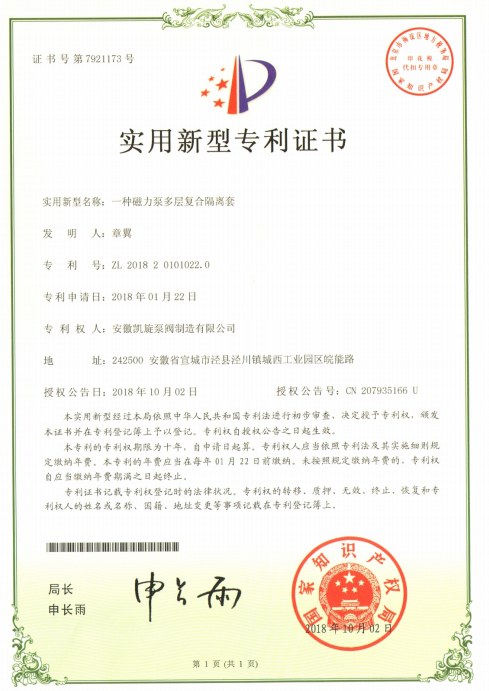 專利證書:一種磁力泵多層復合隔離套