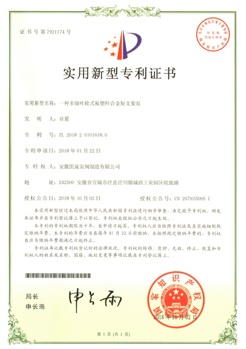 專利證書(shū):一種多級(jí)葉輪式氟塑料合金短支架泵