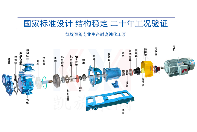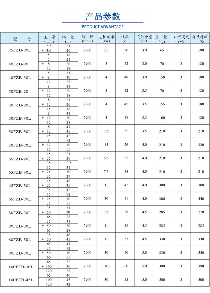 FZB型氟塑料自吸泵的主要部件有泵體、止回閥、前蓋、密封墊、泵蓋、葉輪、密封、軸承箱、電動機(jī)、底座。過流部件使用氟塑料合金制造。泵體部分由吸液室、儲液室、蝸殼、回流孔、氣液分離室等組成。當(dāng)泵啟動后,在離心力的作用下,泵體吸水室中的剩余液體與進(jìn)液管路中的空氣,被葉輪攪拌成氣水混合物。混合物經(jīng)蝸殼進(jìn)入氣液分離室,隨著流速的減慢,導(dǎo)致氣水分離,空氣由泵出口排出,液體經(jīng)回水孔返回泵內(nèi)。反復(fù)多次循環(huán),進(jìn)液管道中的空氣被排凈,使泵內(nèi)形成一定的真空度,達(dá)到自吸的作用。 FZB自吸泵是抽低液位腐蝕性介質(zhì)的理想用泵。尤其適用于抽吸低位槽工況,安裝時無需另配底閥,自吸高度范圍在1-5米內(nèi)。擁有更大的氣液分離室,通暢的回流通道,且進(jìn)口設(shè)計有先進(jìn)的止回閥,防止停泵后液體回流。泵高低壓區(qū)密封可靠,自吸時間明顯縮短,進(jìn)口抽空力強(qiáng),大幅提升自吸性能。泵體設(shè)計有灌液孔、放液孔,最大限度滿足了不同工況下的使用需求。